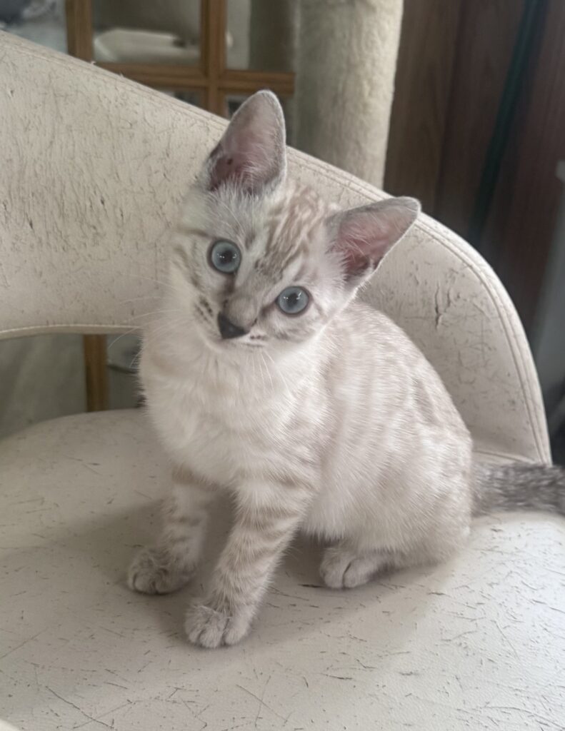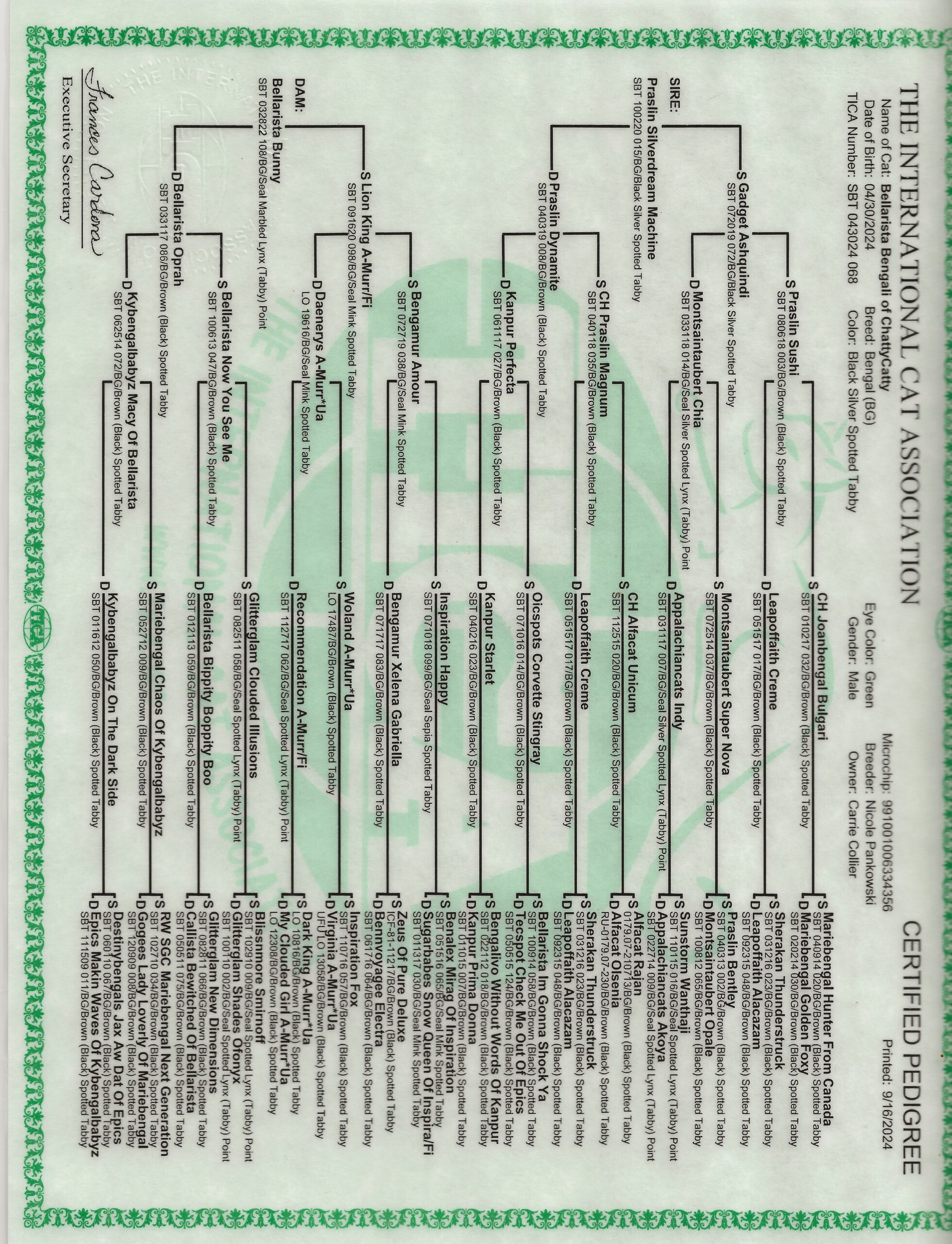 A gorgeous, charming Silver Bengal, also with an amazing pedigree and clear health checks also performed. He is loving and has such a regal and sophisticated personality! He is producing such amazing kittens with Latte.